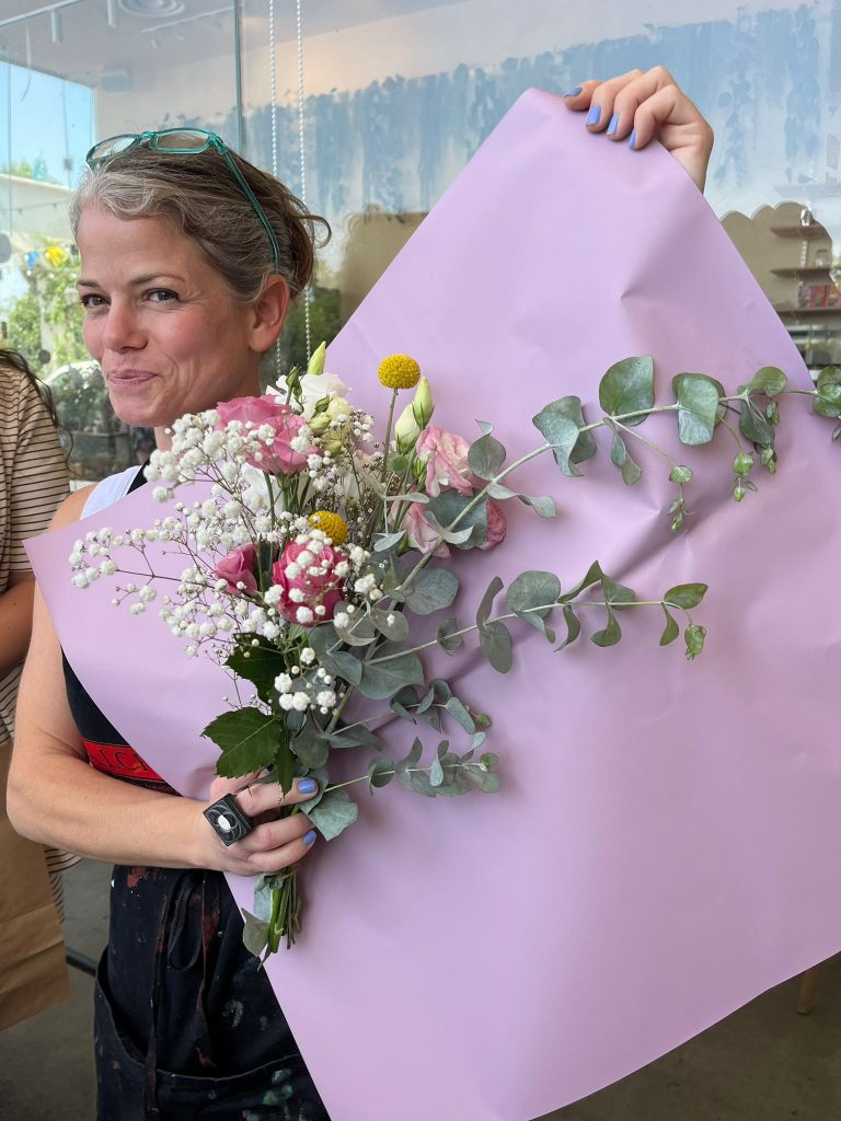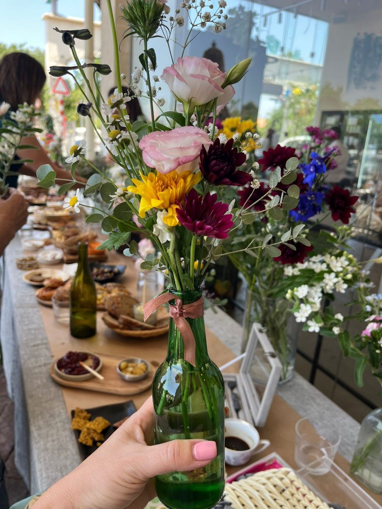 אחרי שסיימנו לנשנש, נפגשנו עם ניצן קיש ארגמן, המוכרת כ”גברת עם הפרחים“. ניצן מעבירה סדנאות בשזירת פרחים. יחד איתה שזרנו פרחים לשבת.